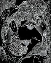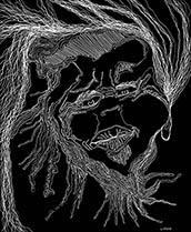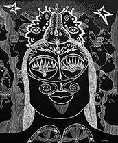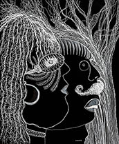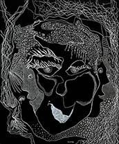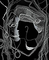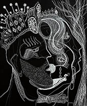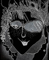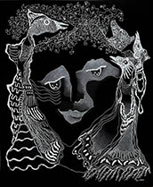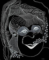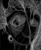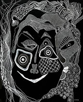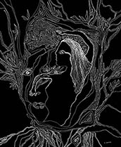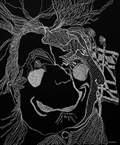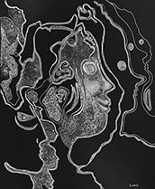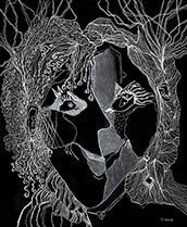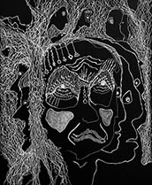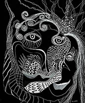 When I rediscovered, in my studio, many sheets of 14” x 17” black paper that I had been itching to use for a long time, all I needed was white ink, white pencil and white oil crayon to get to work with my usual mindset of: "Plan to have no plan."