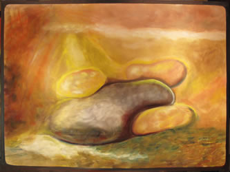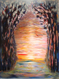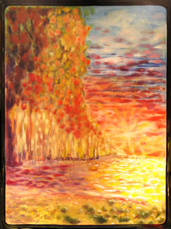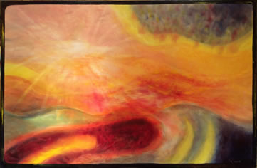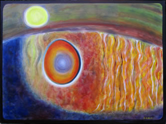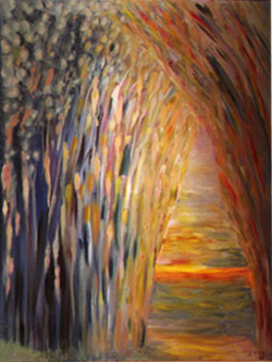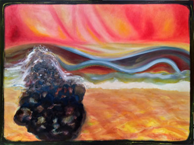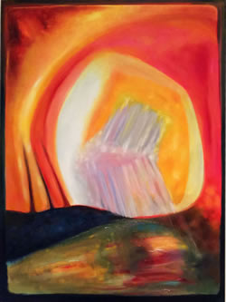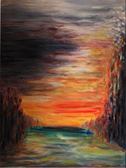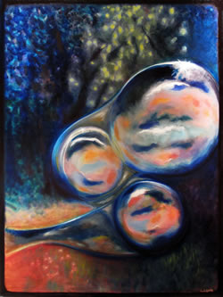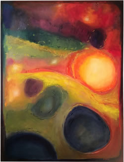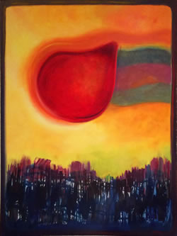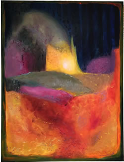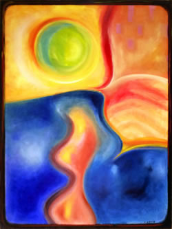 Memories of the Future is an on-going series of oil paintings on canvas currently numbering 15. They represent the artist's compulsion to fully explore a subject. The 15 are based on the artist's miniature wax and pigment paintings, a series unto themselves. Memories of the Future depicts brilliantly colored fanciful and figmentary land, sky and waterscapes. They all bear Louis's signature painted frame, "… so they can't fly away to the dream world from which they came," she says.